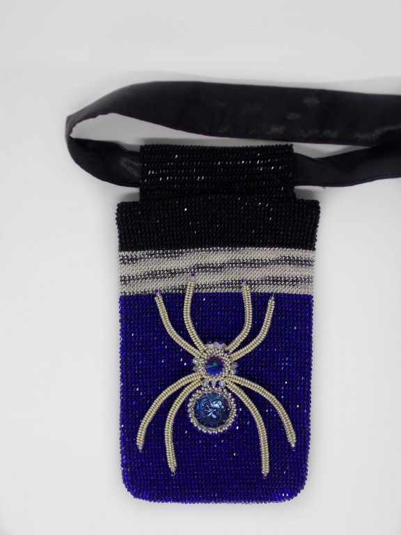 Ось такий павук-брош доповнив маленьку сумочку кольору ультрамарин. Сумочка зав'язується на поясі. У моєму випадку це пояс атласний. Також можна пояс прибрати та вставити будь-який ремінець. А також можно убрать атласний пояс і використовувати, як чохол для телефона. Сумочка зачиняється на магнітну кнопку. Донце дуже вузьке. У таку сумочку можна покласти телефон, ключі, банківську картку.