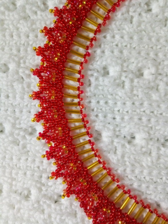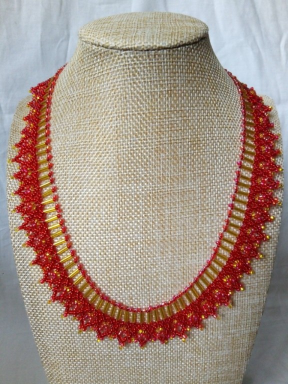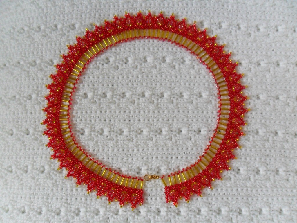 Красочное колье-воротничок из бисера и стекляруса. Застегивается на застежку-карабин. Диаметр круга 12,5, обхват 51,5 см (с застежкой). Можно в других цветах. Изготовление заказа 6 дней.