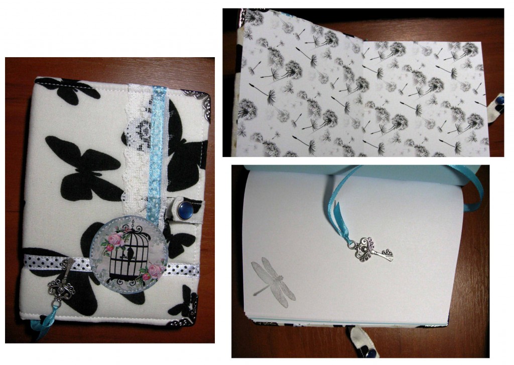 Блокнот формата А6, 98 листочков, половина белых, половина голубых. Некоторые странички проштампованы. Коптский переплет, сплетенный вручную каптал. Застежка на кнопке. Обложка - из приятной на ощупь ткани с мягким уплотнителем, украшенная атласными лентами, кружевом и картинкой с птичкой в клетке. Все "с нуля".