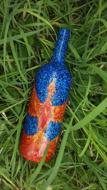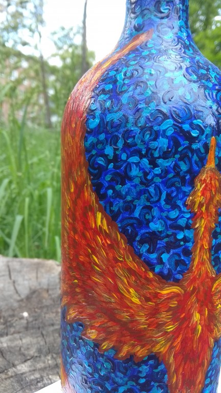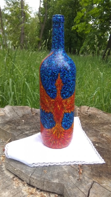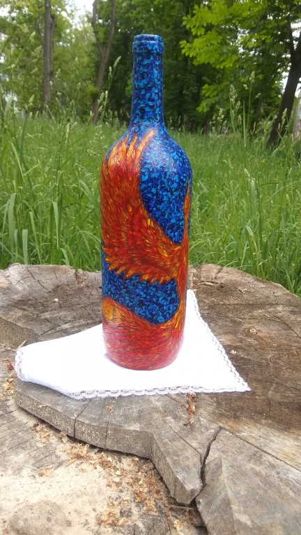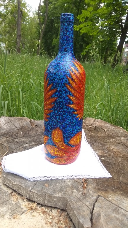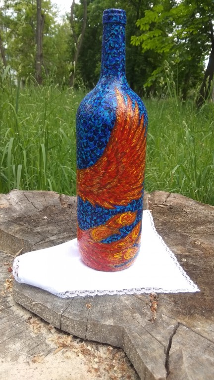 Авторская работа. Рисунок фактурный, написан акриловими красками, для защиты работа покрыта акриловым лаком. Такую бутылку можно использовать как вазу, сосуд для хранения напитков и других жидкостей, или самостоятельный предмет декора дома, студии, кафе или офиса. Рисунок не выгорает под солнечными лучами, водостойкий, изделие можно мыть.