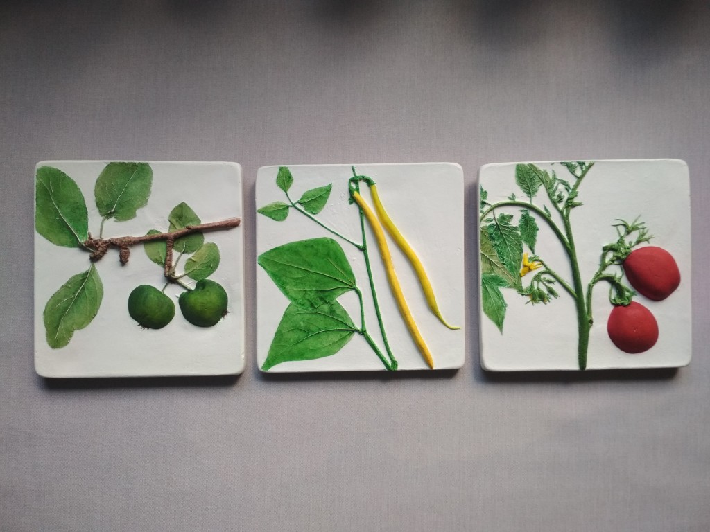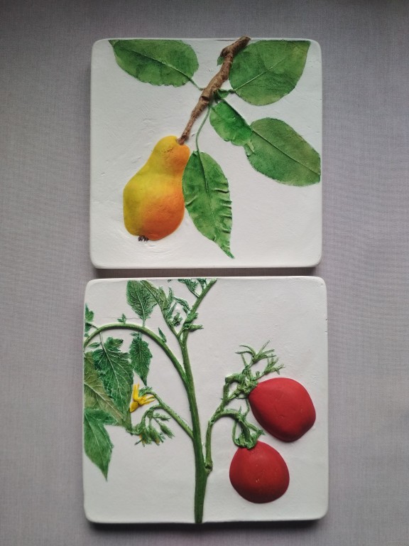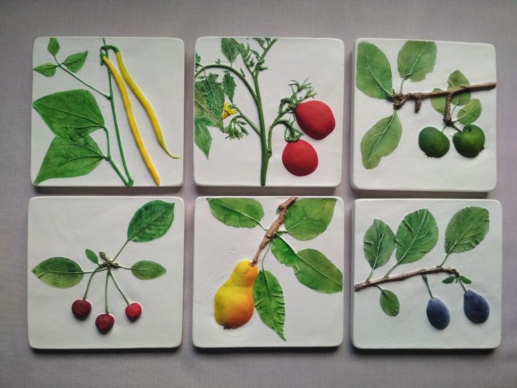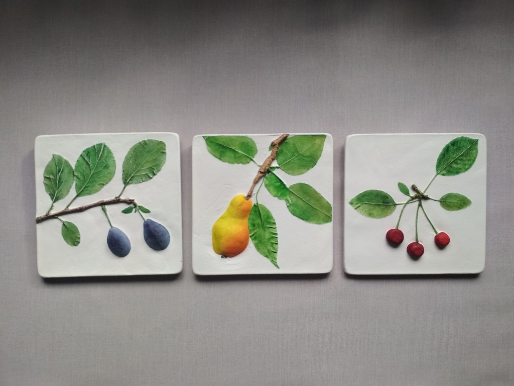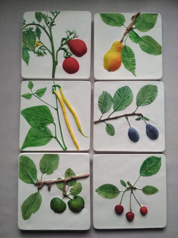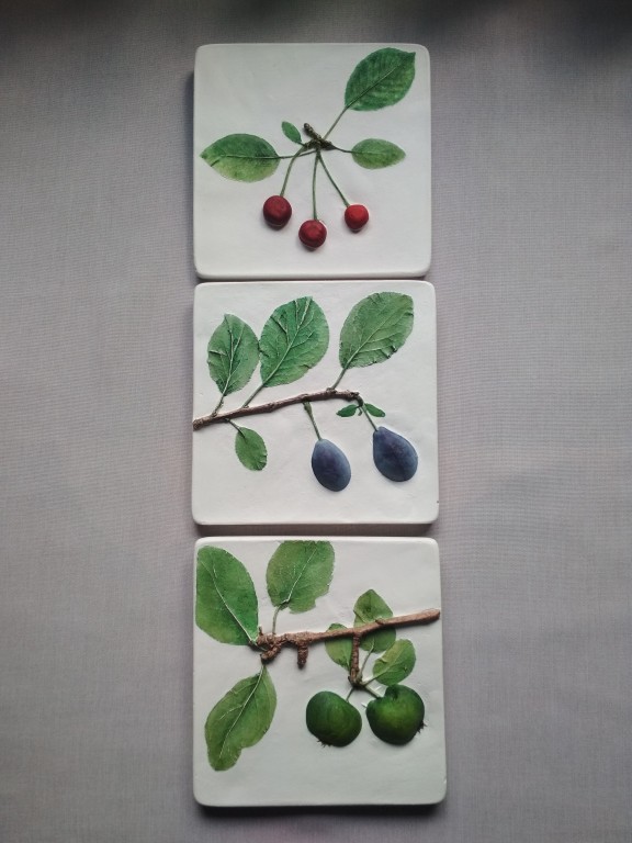 В комплект входят шесть панно . Фон белый (молочный), изображения фруктов или овощей яркое, вкусное, объемное. Очень хорошо подойдут для украшения кухни и создания там теплого настроения.