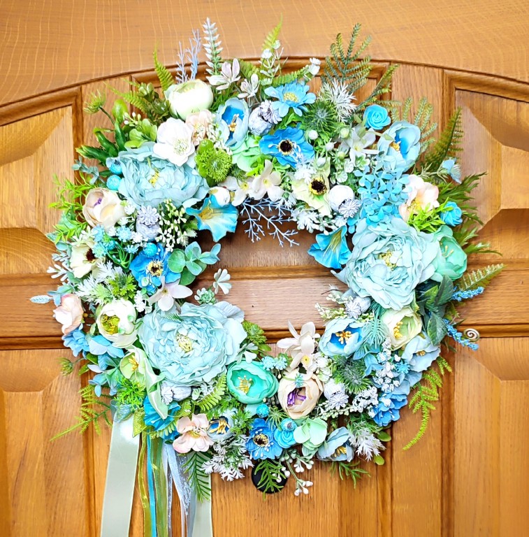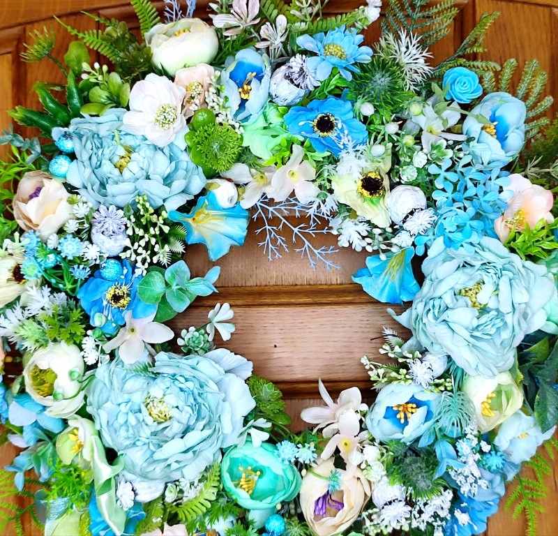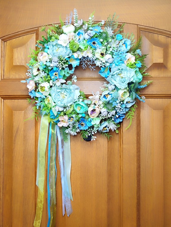Дуже ніжний віночок, доповнений стрічками, буде прикрашати ваш інтер'єр і радувати вас не один рік. Діаметр 42 см.