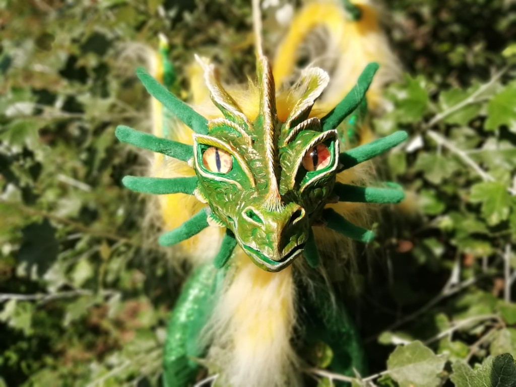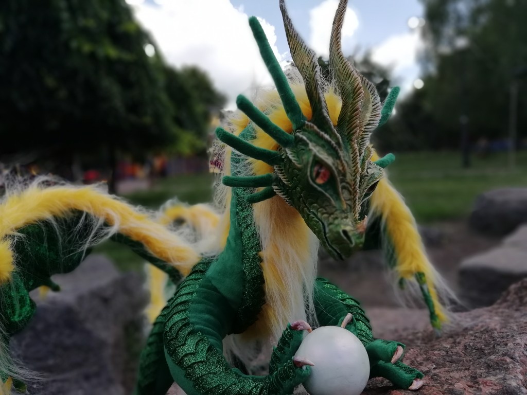 Дракон выполнен в смешанной технике на проволочном каркасе, полностью подвижен (лапы, хвост, голова, шея), крылья можно складывать.