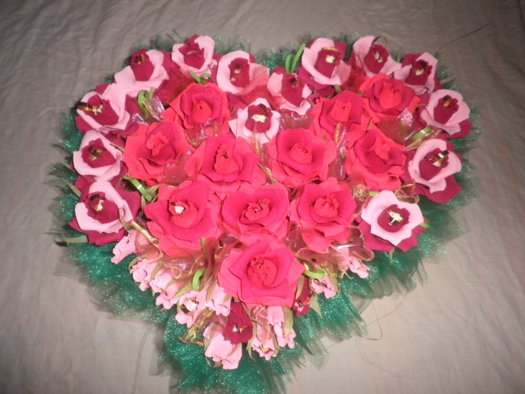Сердце из 37 роз. размер 45*40. Конфеты: Нуга, графиня Вишенка, кофелайк, эклер. Могу изготовить в другой цветовой гамме.