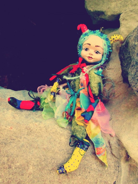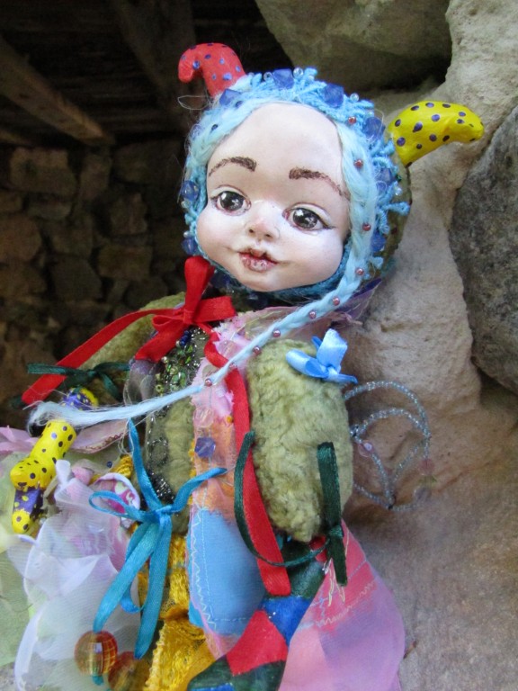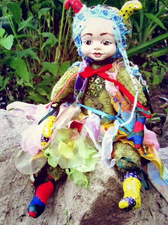 Вот такая яркая Диана - бабочка родилась в начале июля! Она получилась очень милой,доброй и нежной. Куколка сделана в стиле тедди - долл. Личико вылеплено из цернита, тело мягконабивное из винтажного плюша окрашеного вручную. Ручки и ножки папье маше. Куколка расшита бисером. Одежда сьемная, расшита бисером и бусинами. Крылышки выплетены из бисера.