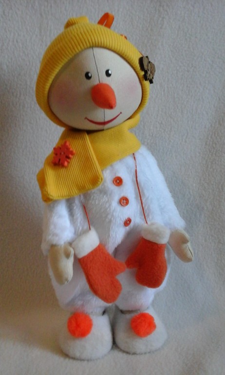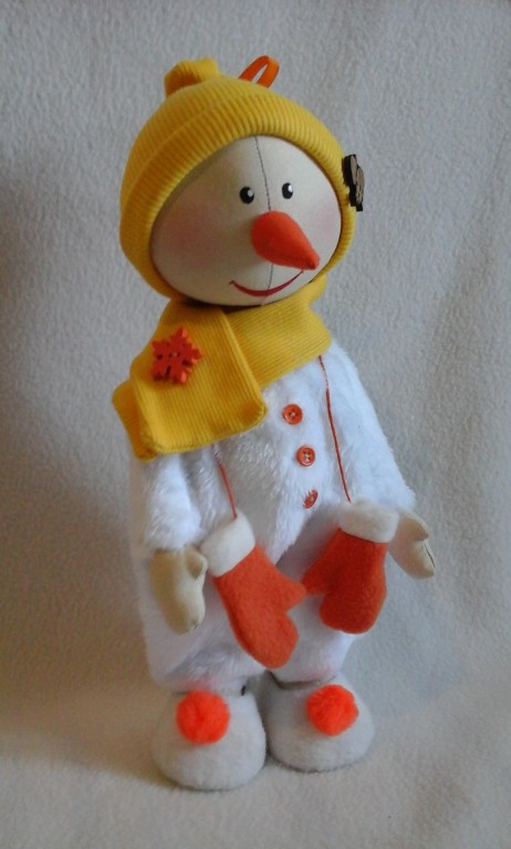 Текстильная - авторская кукла снеговик. Ручки и ножки на пуговичном креплении, одежка не снимается. Сшит из хлопка, набивка синтепух. Рост 30см.