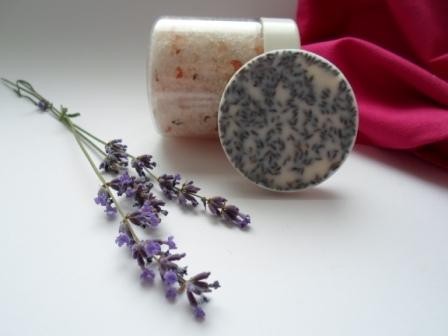 Соль для ванны: морская соль, гималайская соль, масло абрикосовых косточек, эфирное масло лаванды Болгарской, ароматический экстракт черники, персика, цветы лаванды.