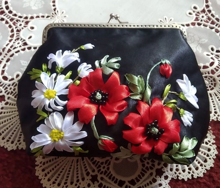 Косметичка изготовлена из шёлка с фермуаром, украшена вышивкой лентами, подкладка атласная.Размер 15*20. Такой аксессуар любой девушке и женщине придётся по вкусу.