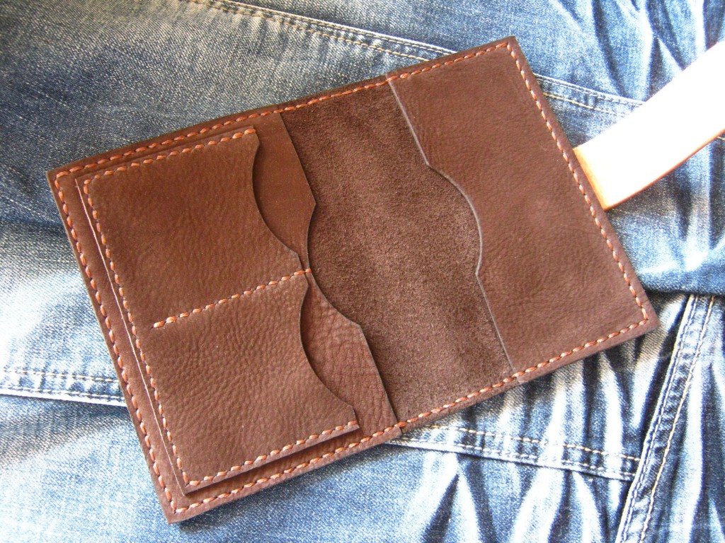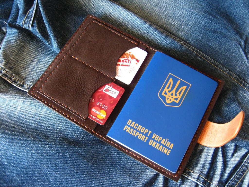 Кожаная обложка для паспорта с одним отделением для купюр и двумя для карточек.