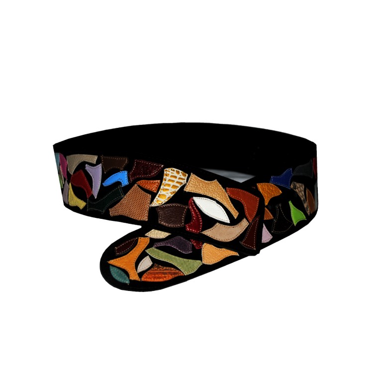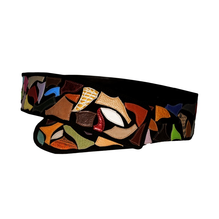 Черный пояс выполнен из натуральной замши. Украшен абстрактным рисунком, выполненным из кусочков кожи разных цветов и фактур (пришиты по периметру). Застежка- скрытая (крючок). На подкладке.