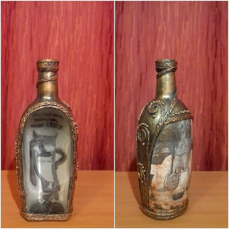 Великолепный подарок для настоящих мужчин и изысканных дам. Оформление бутылки выполнено в технике декупаж. Имитация стекла под состаренную бронзу придает изделию антикварный вид. Сюжет любимого мультфильма создает совершенно особую эмоциональную атмосферу. Благодаря трехслойному покрытию лаком изделие обладает водоотталкивающими свойствами. Оригинальная бутылка это отличное решение для тех, кто хочет приятно удивить необычным, красивым и полезным подарком!