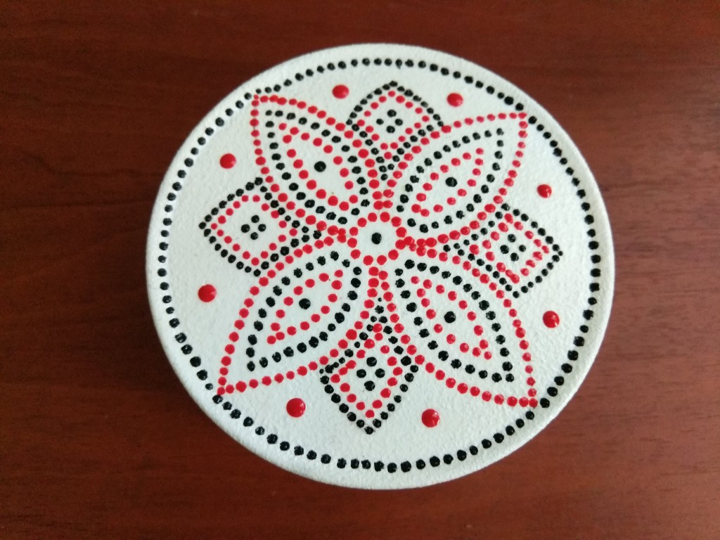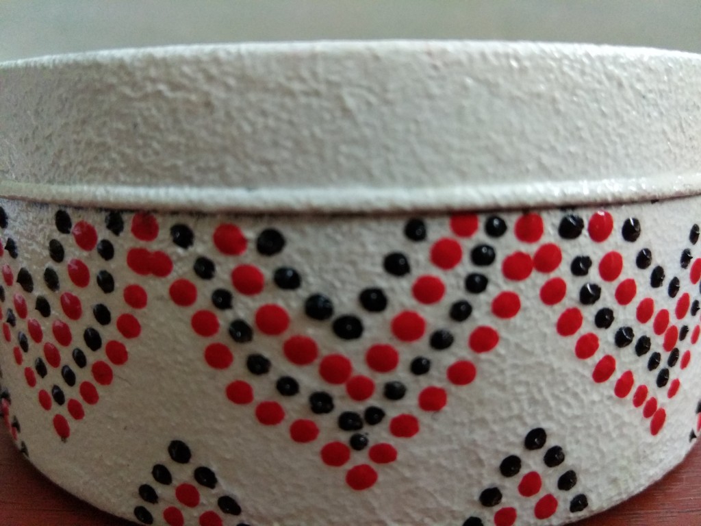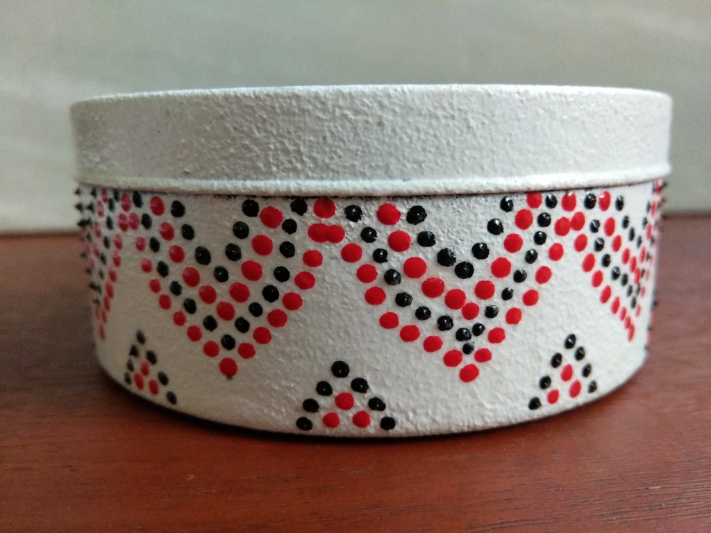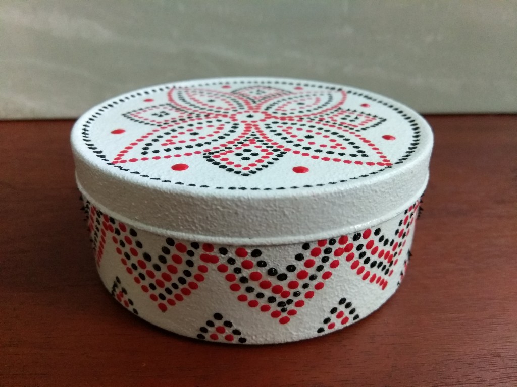 Шкатулка ручной работы в технике точечной росписи. Диаметр шактулки 10 см, высота 4,2 см. Материал шкатулки железо.
