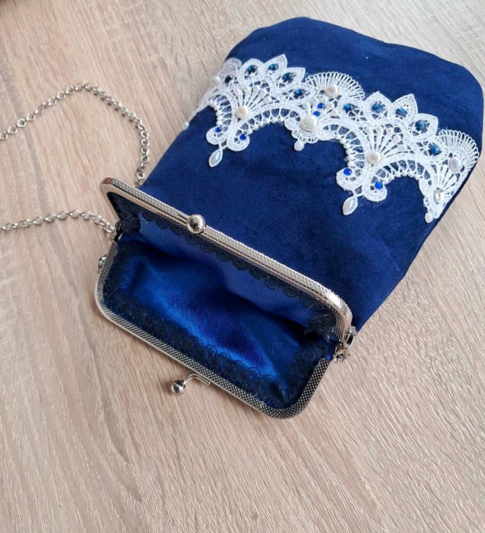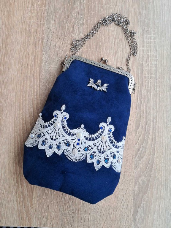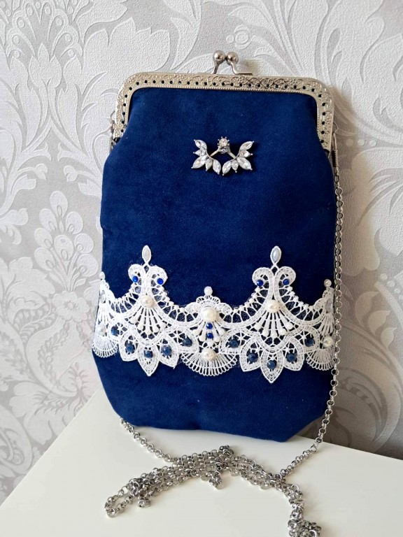 Сумочка виконана з велюру синього кольору, ущільнена дублеріном, добре тримає форму, з фермуаром, на ланцюжку, прикрашена мереживом і стразами, підкладка атласна. Декорована яскравою прикрасою.Такий аксесуар будь-якій дівчині і жінці припаде до смаку. Стильно, красиво, оригінально! Телефон, парфуми, різні дрібнички поміщаються в сумочці.