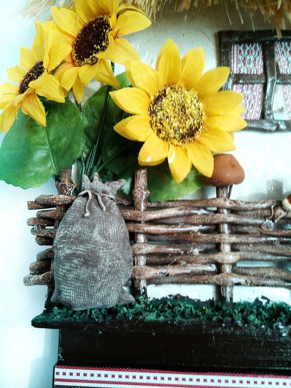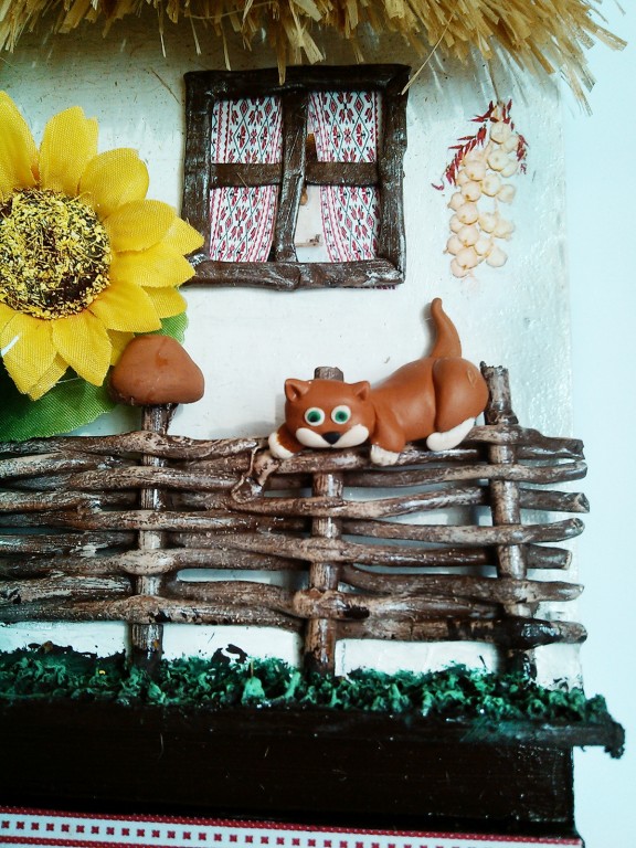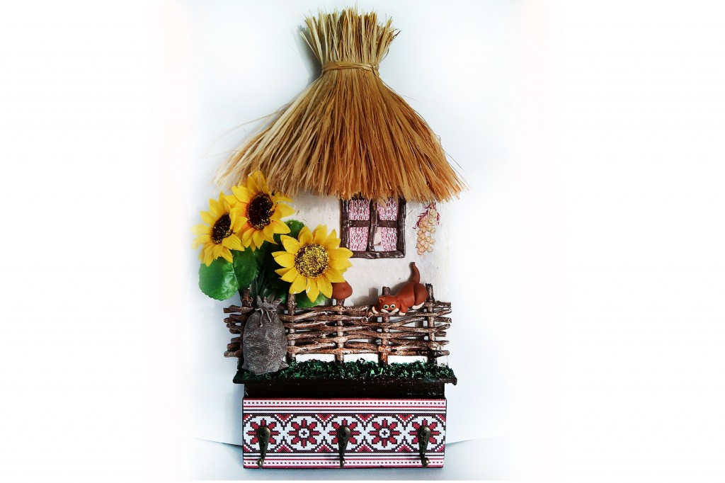 Ключница настенная в виде украинской хаткиНастенная ключница домик рассчитана на 3 крючка. Сзади имеется 2 подвеса. Покрыта защитным лаком поэтому не боится механического воздействия. Крыша сделана из натурального лыка. Объемные детали вылеплены из полимерной глины. Цвета из ткани. Сроки изготовления при отсутствии готовой работы 5 дней. Точное повторение работы невозможно.Этот красивый и практичный предмет отличается довольно компактными размерами и идеально подойдет даже для квартир с небольшими прихожими..