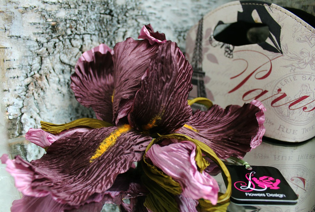 Ирис выполнен из атласа и натурального шелка, каждый листочек отгофрирован вручную. Размер цветка около 15 см