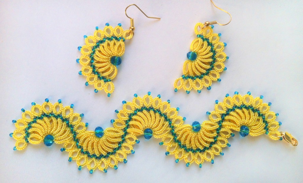 Серьги и браслет выполнены из хлопковых или полиэстровых нитей, чешского бисера и хрустальных бусин в уникальной французской технике кружева фриволите. Возможна продажа отдельно сережки 100 грн, браслет 150 грн. Возможно изготовление в другом цвете.