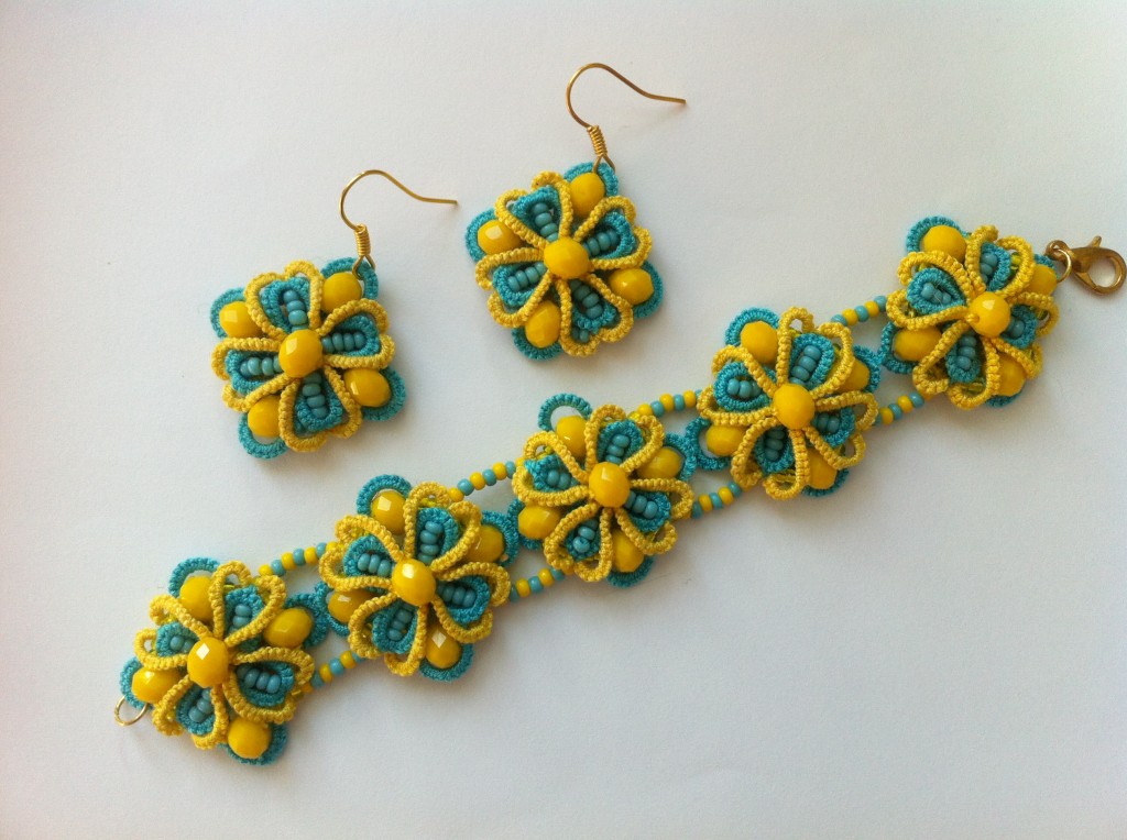 Серьги и браслет выполнены из хлопковых ниток, чешского бисера и хрустальных бусин в уникальной французской технике кружева фриволите, анкарс.
