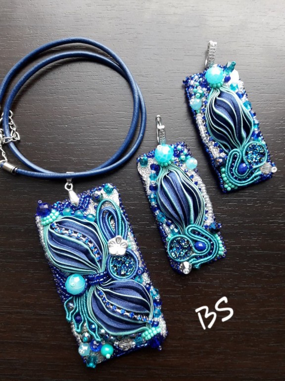 Комплект- кулон и серьги. Использованы материалы: сутаж, лента Shibori , чешский хрусталь, гипоаллергенная фурнитура. Стильное украшение станет отличным подарком.