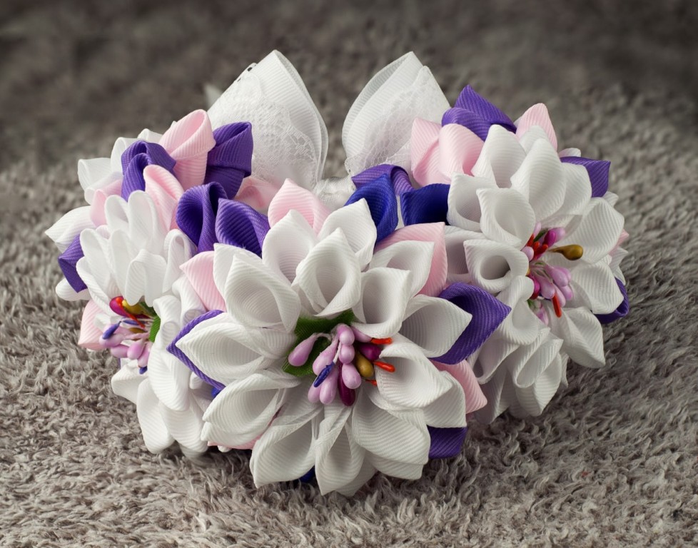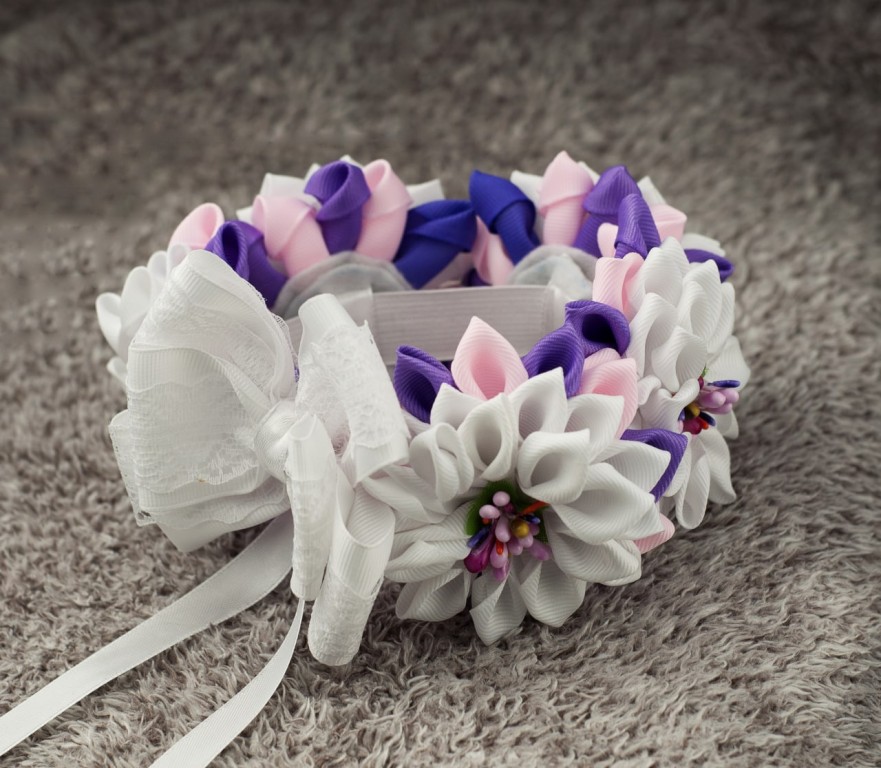 Зроблена із репсових стрічок. П'ять великих квітів і великий бант з мереживом.