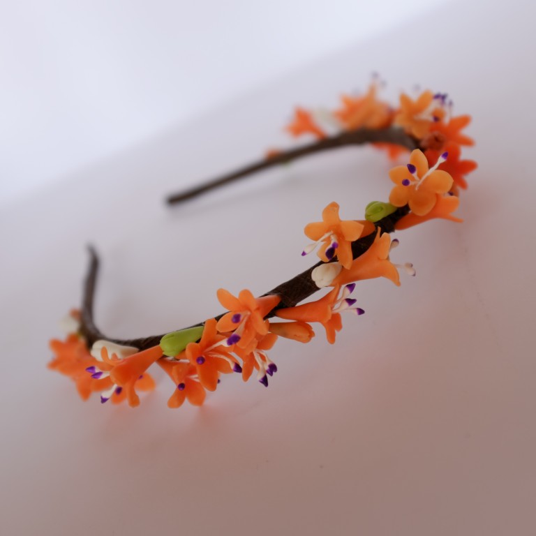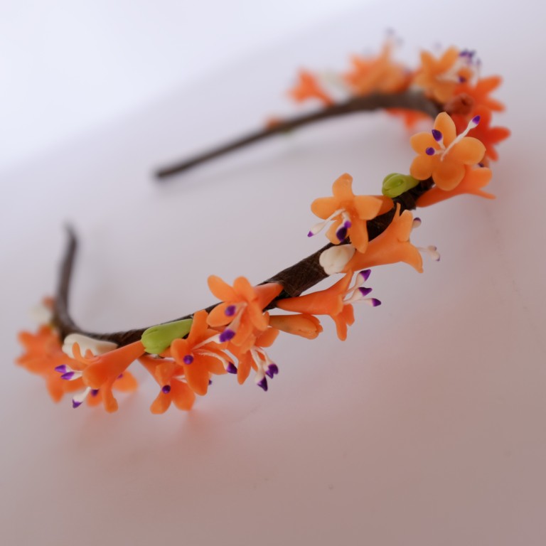 Обруч с цветами из тайской глины Modern Clay. Ручная работа. Ширина обруча 0,5 cм. Обруч металлический в тейп-лент. Отлично держится на голове. Красиво смотрится на волосах.Для девушки.женщины.