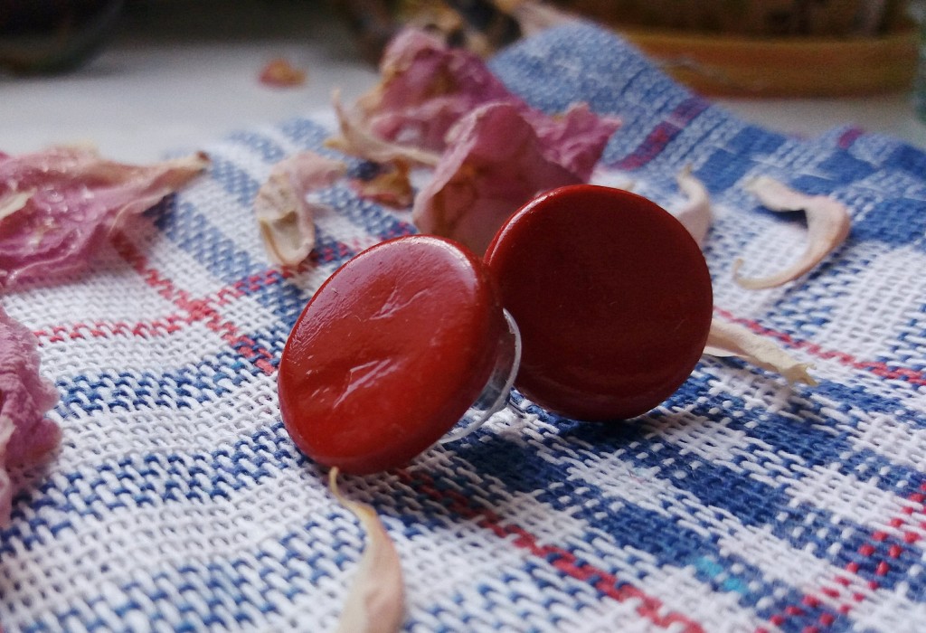 Красные круглые серьги гвоздики. Диаметр 1,7 см. Выполнены из полимерной глины и покрыты лаком. Легкие, фурнитура надежная. Для большей долговечности рекомендую не гнуть, не царапать, не держать долго в воде. Заказывайте и носите с удовольствием!