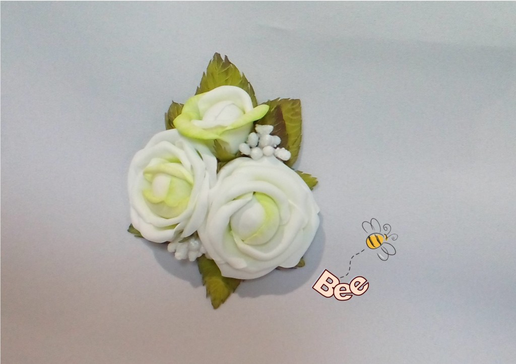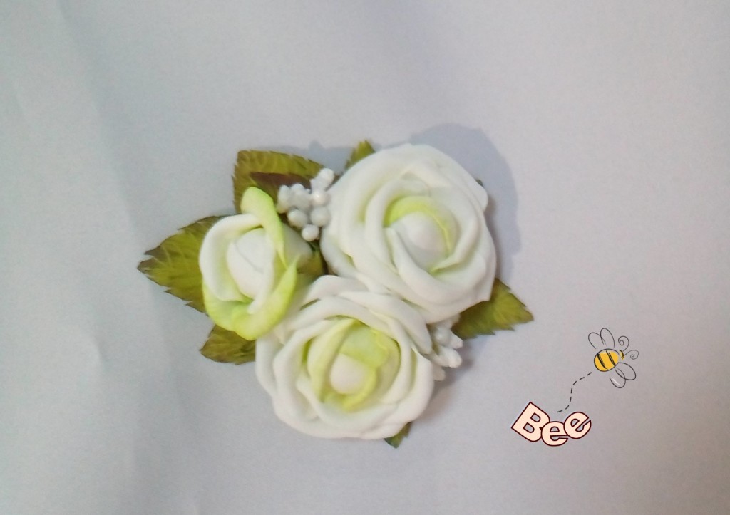 Изготовлю на заказ. Заколка или брошь-бутоньерка (по желанию) украшена цветами ручной работы из фоамирана. Цветы - розы (3 шт.) и мелкие наполнители. Розы тонированы акриловыми красками. Можно мыть, воды не боится.