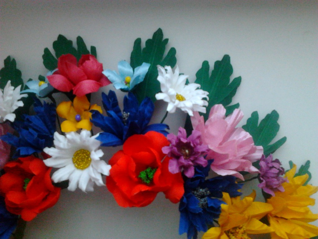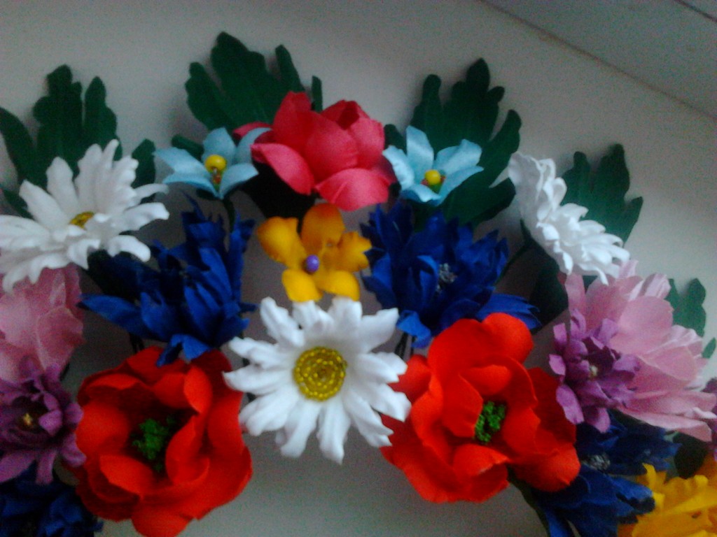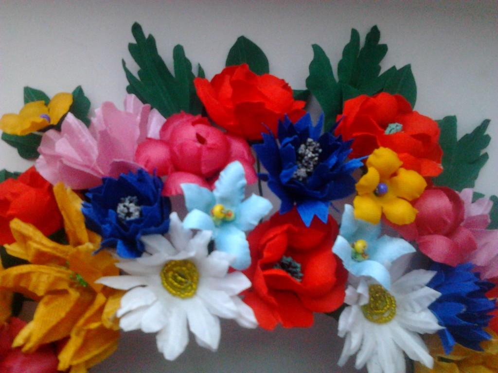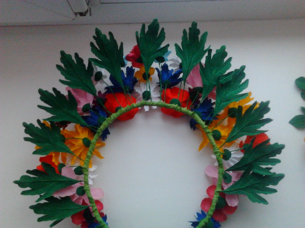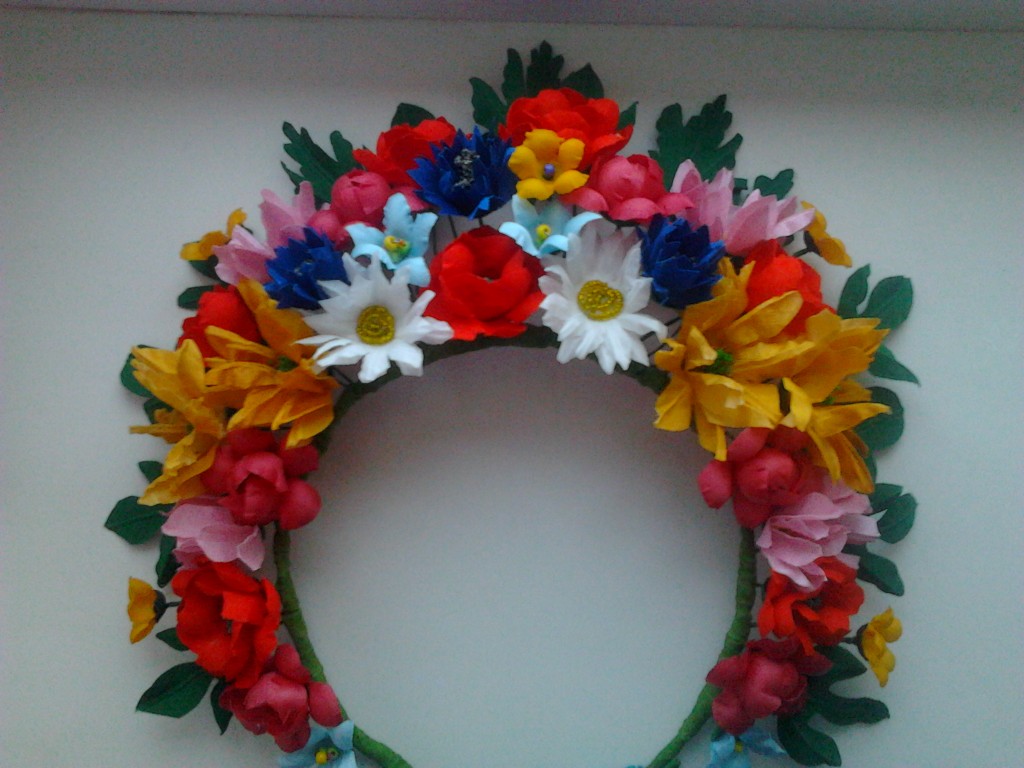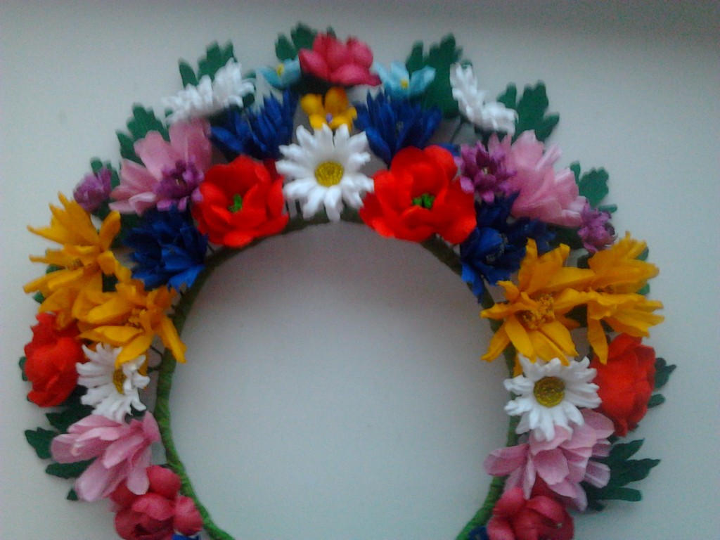 Вінок український. Дуже нарядний, пишний, помітний, легкий. Квіти виготовлені з тканини. У ромашок - серединка із бісеру. Розмір можна регулювати. Зроблений акуратно.