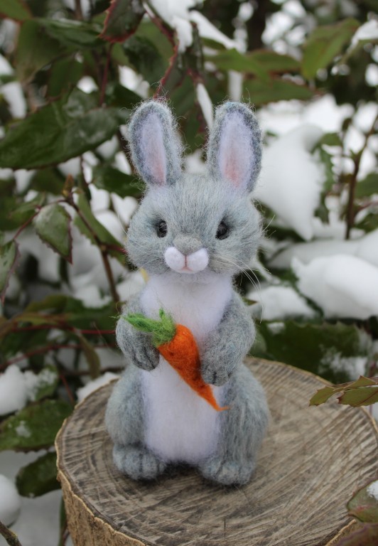 Заяц з морквою. Валяна іграшка інтер'єрна ручної роботи. Висота 19см, вуса мононити, очі бусінки. Кролік приємний на дотик тактильно, так як виконаний з натуральної овечої шерсті. Зайчик колекційна іграшка для інтеоєру. Інтер'єрна іграшка! Зайчик буде гарною прикрасою та доповнювати ваш інтерєр. Веселий, позитивний та життєрадісний. Виконаний з любов'ю та душею. Всі мої іграшки якісні та зроблені з любов'ю та душею та кожна в одному неповторному екземплярі.