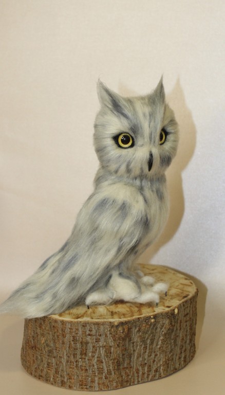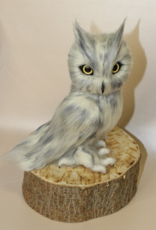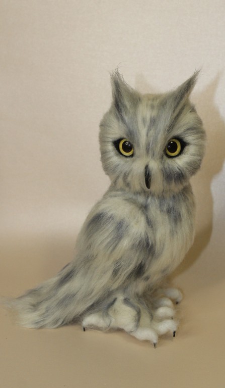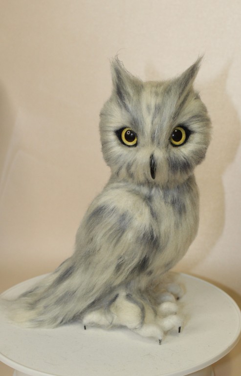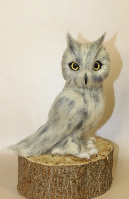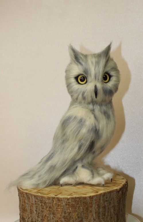 Cова валяна іграшка з вовни. Полярная сова з ушками. Має блискучий вид, в вовну додала волокна шовку. Приемна на дотик. Красуня сова вийшла. Висота 19см, ширина 17 см, очі скляні ручного розпису, клювік з fimo ручної лепки. Чудовий подарунок як дитині, так і дорослому. Птиця інтерєрна іграшка, валяна з шерсті. Прекрасний подарунок як дівчині, так і хлопцю. Це авторська іграшка ручної роботи. Зроблена з любовю та душею. Стане вашим улюбленим талісманом на вдачу, позитив та гарний настрій. Чекає на новий будиночок.