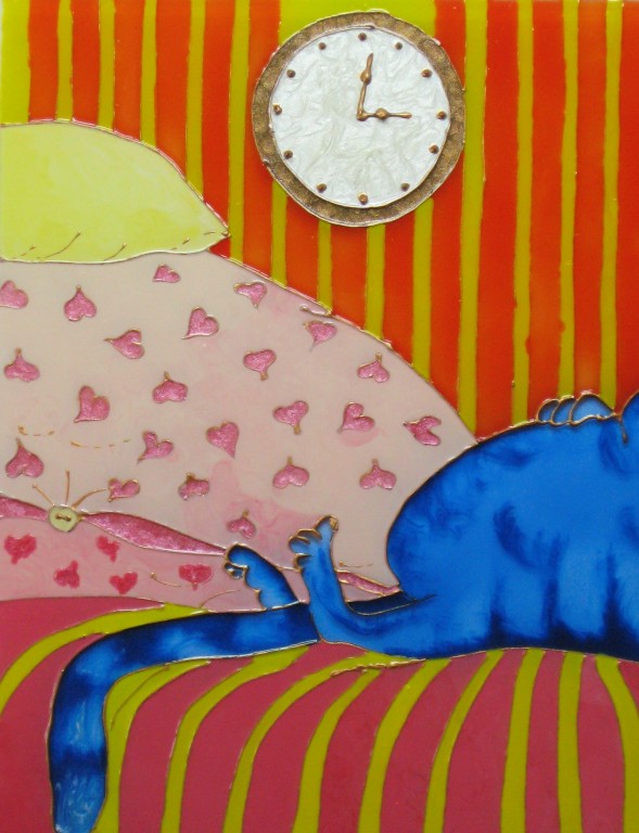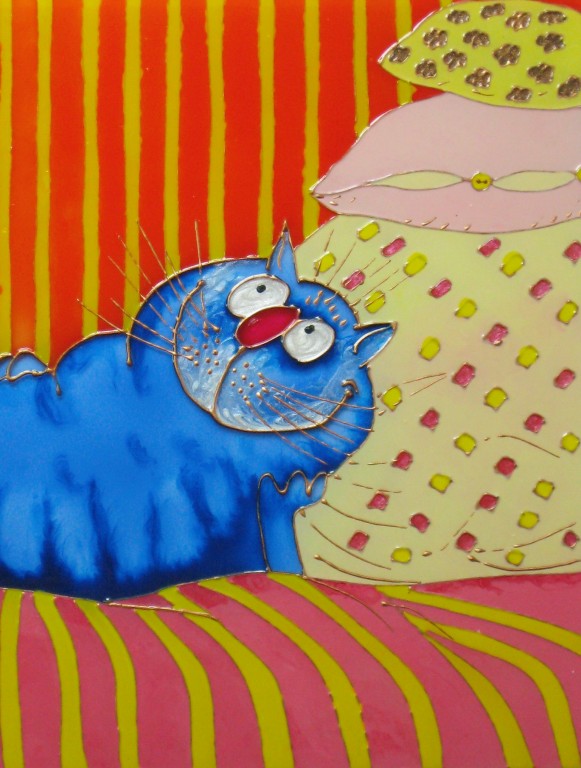 Картина расписана витражными красками и контуром. Рисунок нанесен на прозрачное стекло. Вольная копия рисунка художницы Ирины Зенюк (Рина).