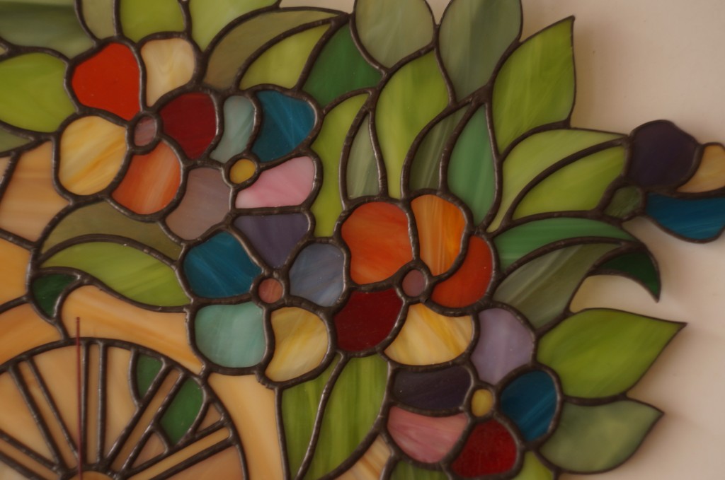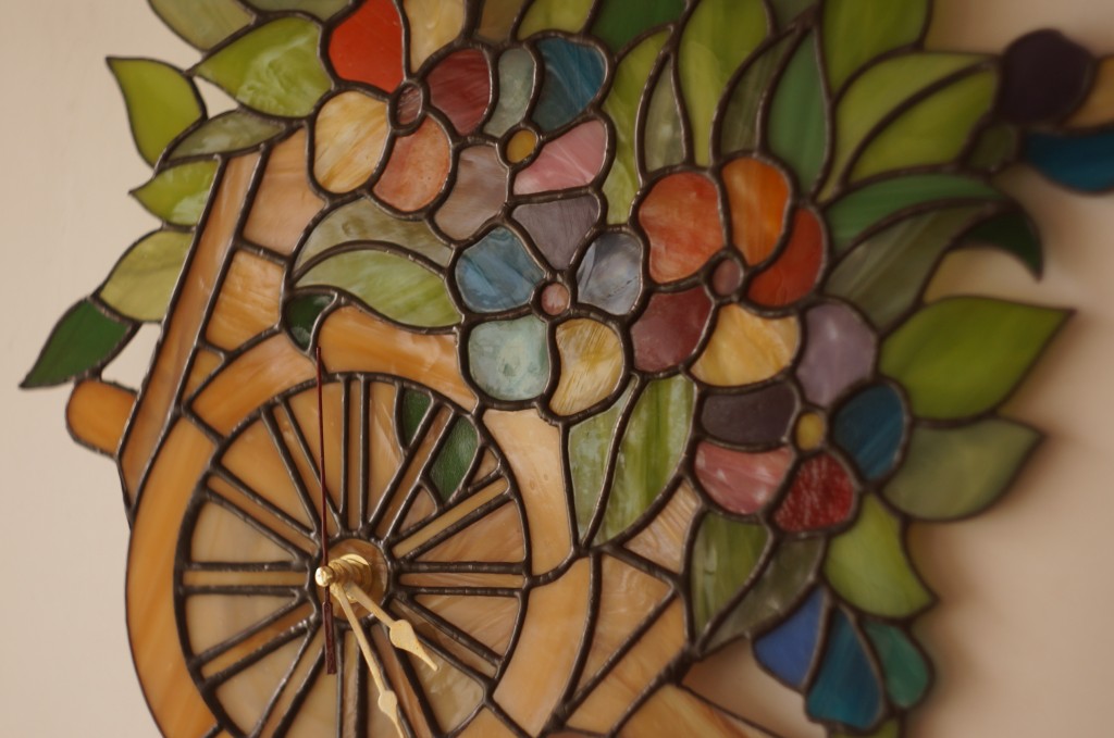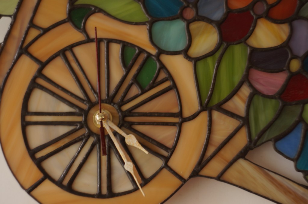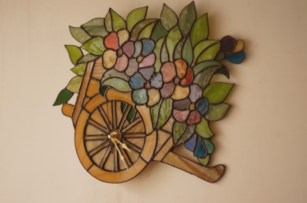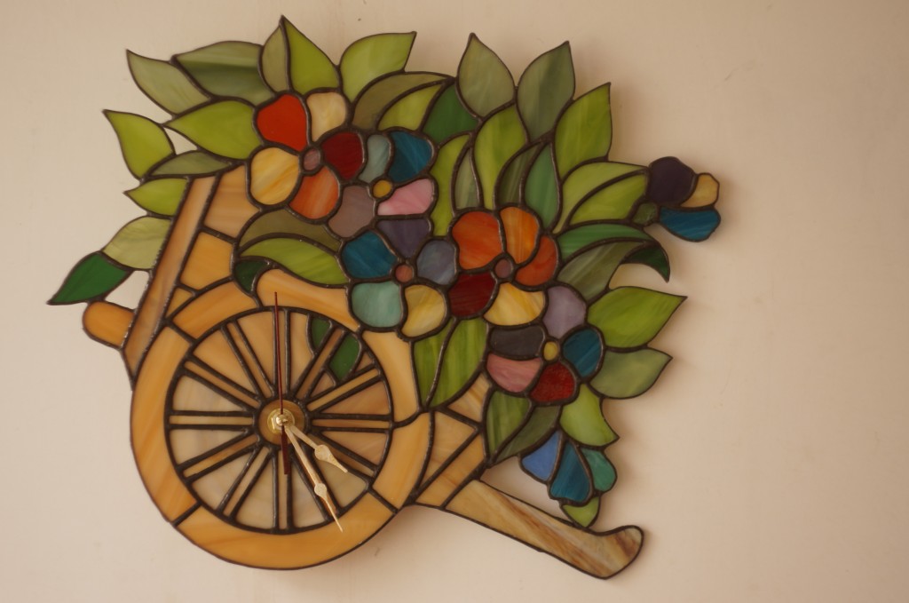 Продам настенные часы ручной работы "Цветочная тележка" выполненные из американского стекла "Spektrum" в технике "Тиффани",в единственном экземпляре. Очень элегантная работа которая украсит любой дом или квартиру,отличный подарок для девушек и женщин ,размер часов 30х28см.