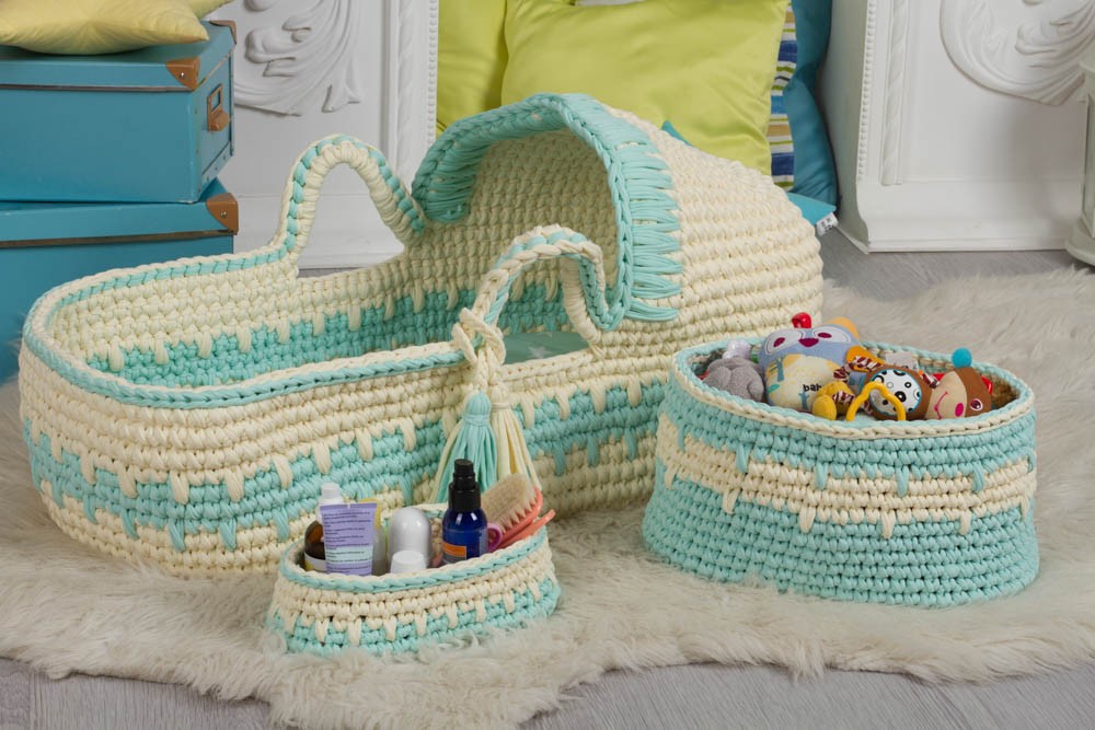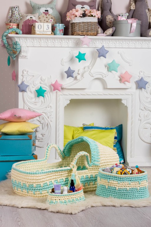 Комплект состоит: детская люлька Волшебный дом, средней полуовальной интерьерной корзины и маленькой полуовальной интерьерной корзины.