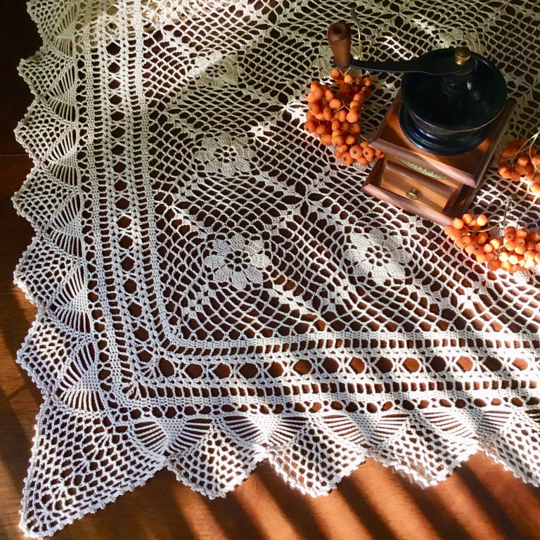 Скатерть вязаная крючком со сложной каймой. Нежного бежевого цвета. Отлично подойдёт для интерьера в стиле кантри или стиля винтаж.. Хороший подарок на день рождения или новоселье для родственников и друзей.