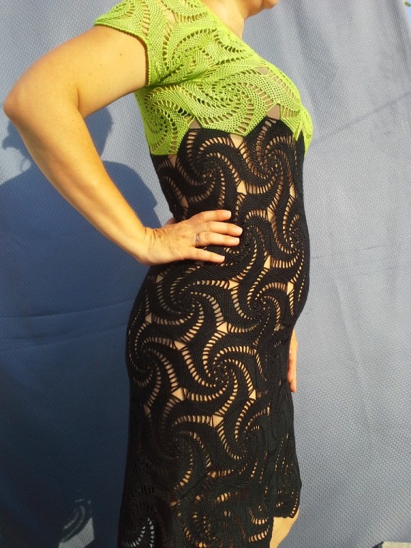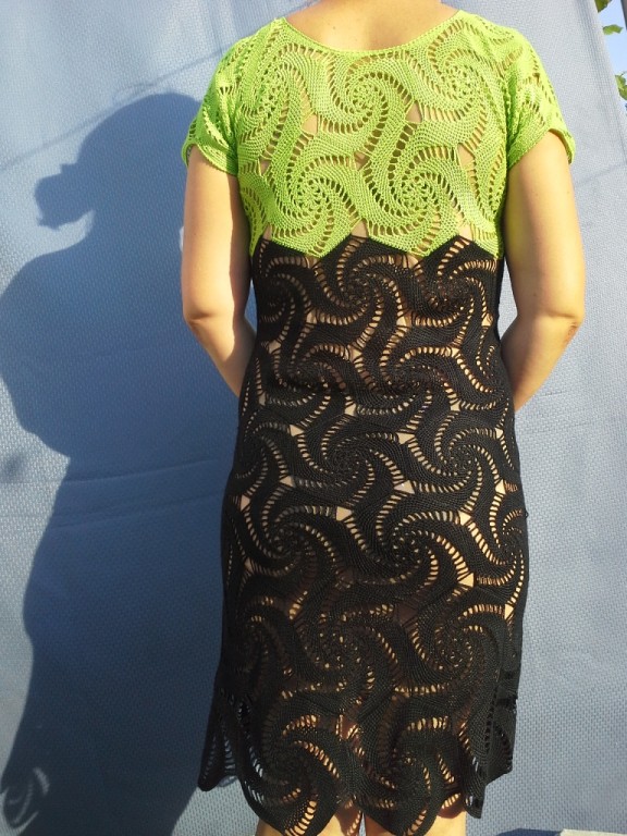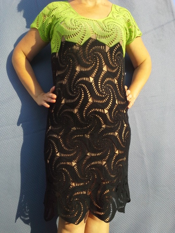 Чёрно - салатовое платье из мотивов, на подкладке, для женщины. Платье вязанное крючком из тонкой акриловой нити. Подкладка, сеточка телесного цвета, на ней хорошо видно рисунок. Размер платья: Обхват груди 92 см. Обхват талии 82 см. Обхват бедер 92 см. Длинна от талии 50 см.