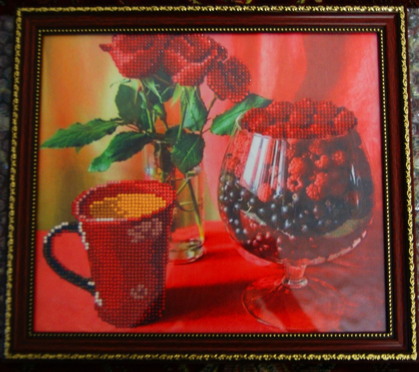 Картина вышита в стиле "алмазной вышивки" круглыми стразами. Работа оформлена в багет, под стеклом. Размер картины 33х29 см.