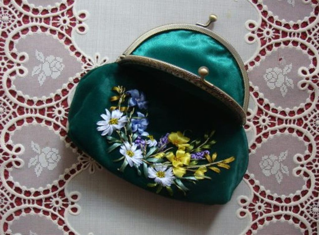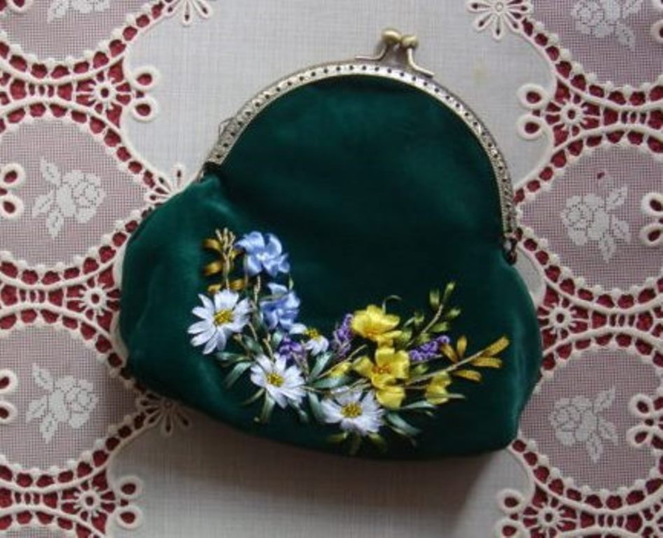 Косметичка изготовлена из зелёного велюра с фермуаром,, украшена вышивкой лентами, подкладка атласная.Размер 15*18. Любой девушке придётся по вкусу.