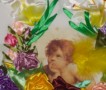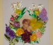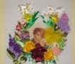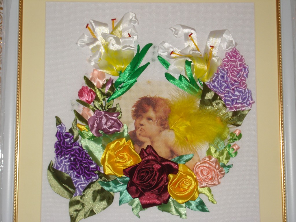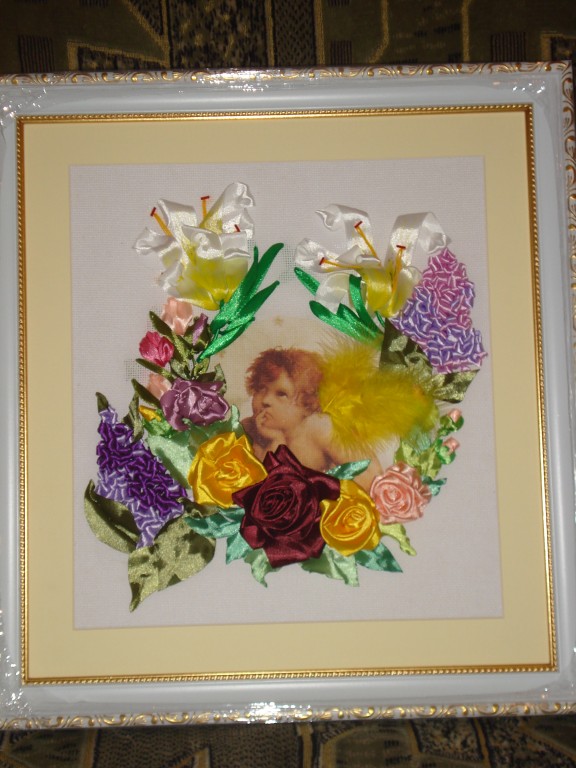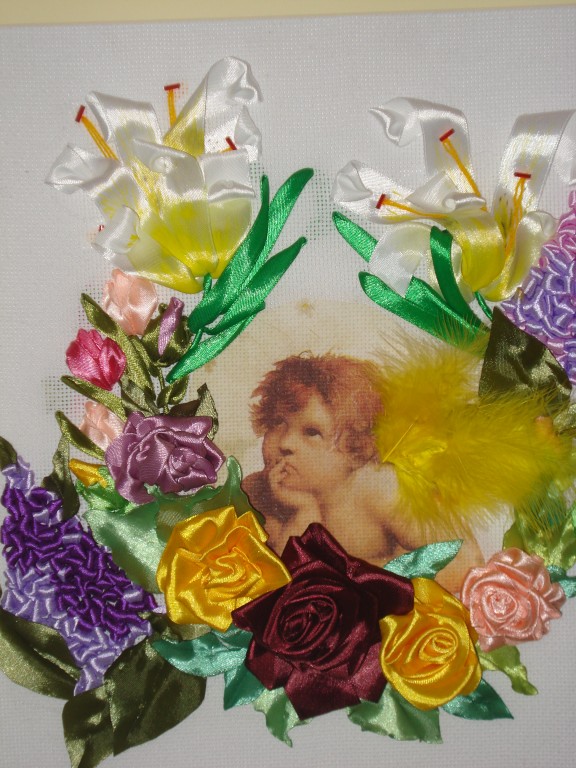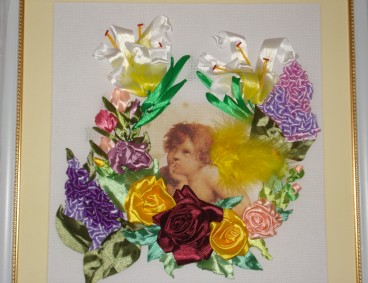 В центре картины-декупаж. Крылья ангела выполнены из лебединых перьев, все остальные элементы вышиты лентами.