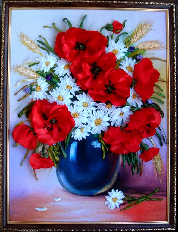 Картина выполнена атласными лентами методом вышивки и аппликации. Это прекрасный подарок ко всем праздникам, юбилеям и торжествам!!! Что может быть оригинальнее, чем изделие ручной работы! Размер картины - 30*40.