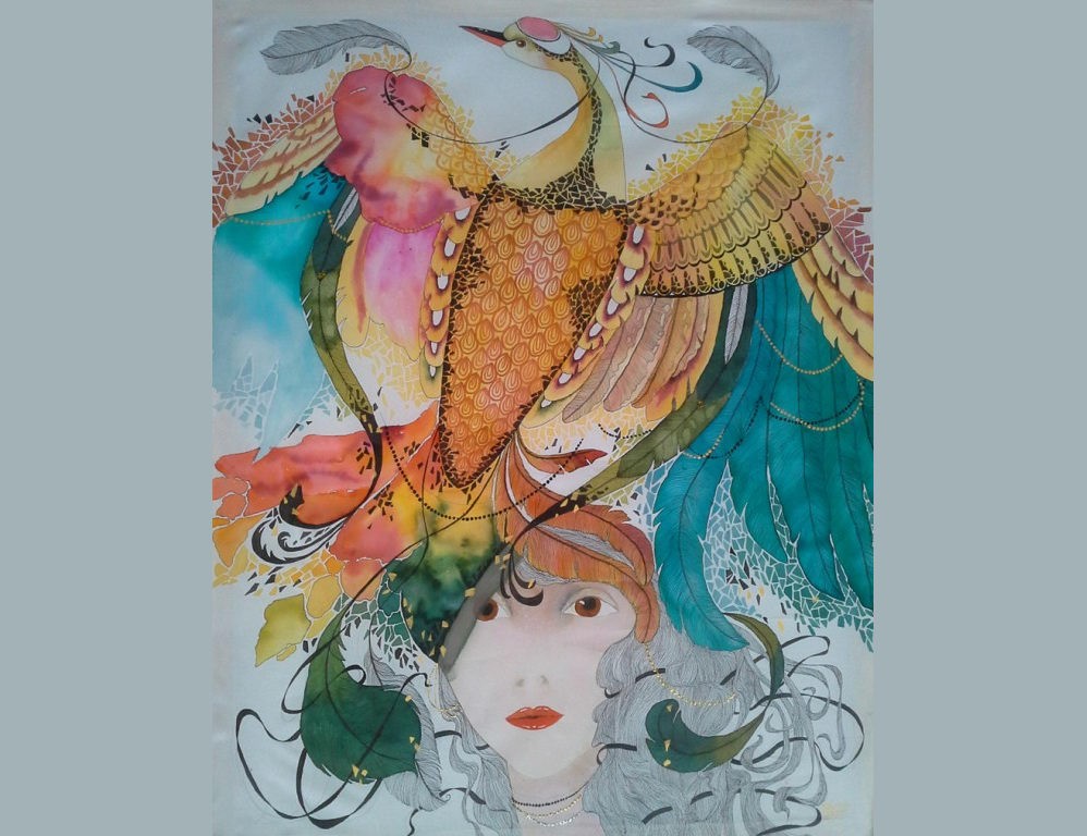 Картина «Жар птица» выполнена в технике батик на натуральном шелке, размер 70х90.